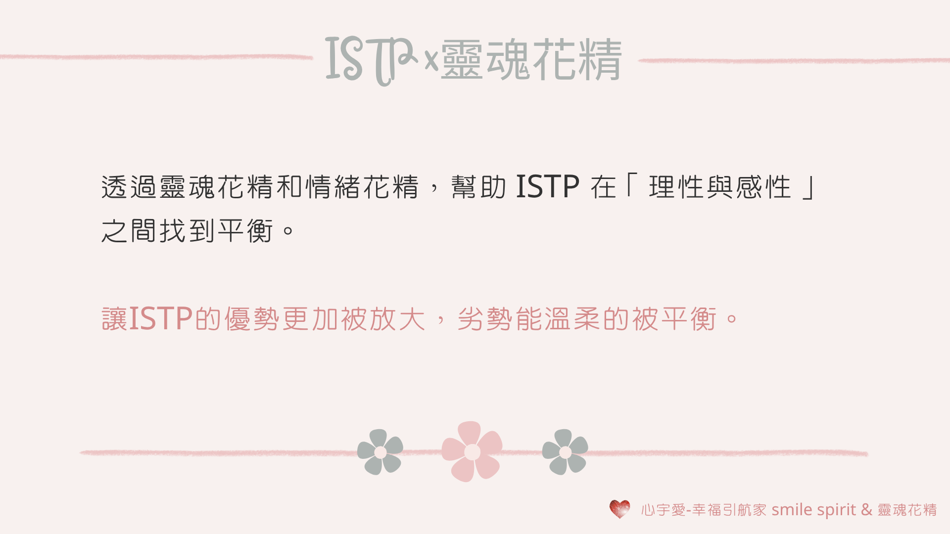 在靈魂花精中, 我們可以透過幾支靈魂花精和情緒花精,幫助 ISTP 在「理性與感性」之間找到平衡。