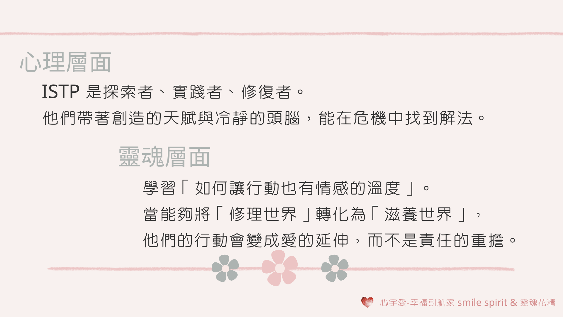 【ISTP與靈魂花精:當行動成為靈魂的語言】心宇愛-幸福引航家smile spirit