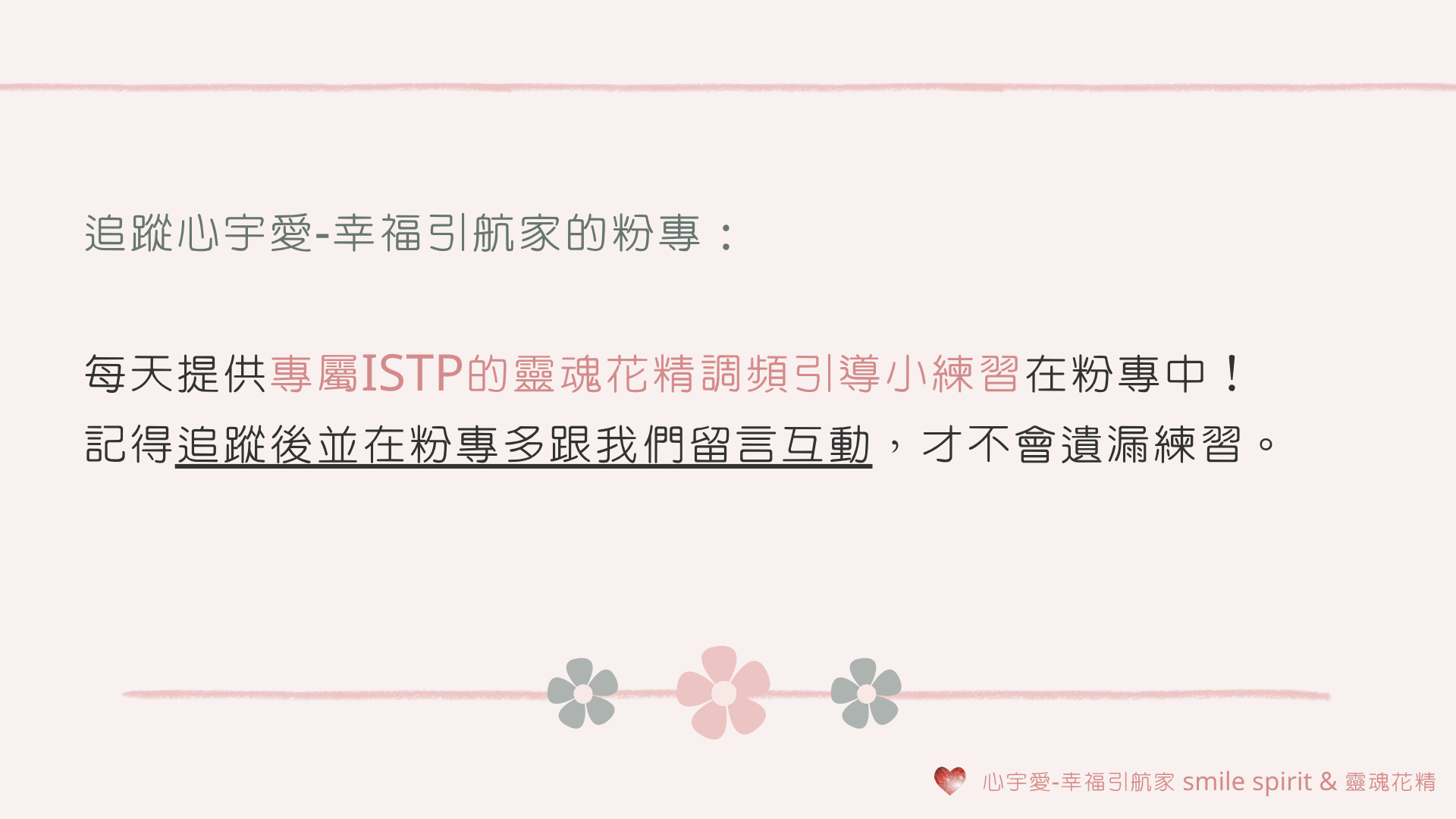 追蹤心宇愛-幸福引航家的粉專,我們將每一天提供專屬ISTP的靈魂花精調頻引導小練習在粉專中喔!記得在粉專多跟我們留言互動,才不會遺漏練習。